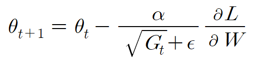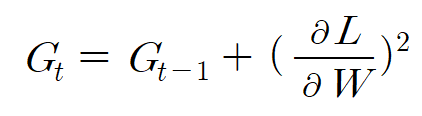 위의 옵티마이저에서 학습률은 고정된 값이었다. 하지만 학습이 진행될수록 더디게 파라미터를 바꾸어가며 점점 수렴해가야 할 필요성을 느꼈다. 따라서 Adagrad에서는 아래와 같은 방법으로 학습률을 변화시키는 효과를 준다.