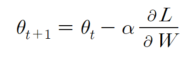 이 식을 통해 파라미터인 x_0를 현재 손실함수에서의 기울기를 통해 갱신한다. 알파값은 학습률로, 높은 산에서 골짜기로 하산할 때의 보폭으로 생각할 수 있다. L은 손실함수, W는 모델의 가중치이다.